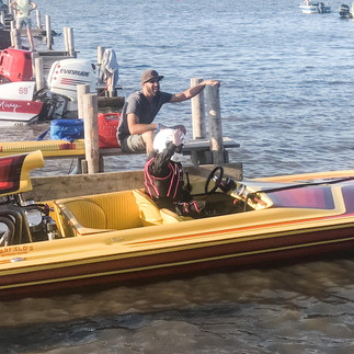Colleen met Brandon Callahan in 2018, and by the 2019 season, Colleen was behind the wheel of her first boat, a yellow and red TX-19, with Brandon as her coach. "The Lake Racer guys were great!" Colleen shared. "They were as happy to see me out on the water as I was and, even as competitors, didn't hesitate to help me find my way around the course." Competing in the Lake Racer inboard class, Colleen spent her first summer learning drag boat racing basics: putting the TX-19 in gear, rolling up to the starting line, hammering down on the pedal for a full 800 feet, and safely easing out of a full-throttle.